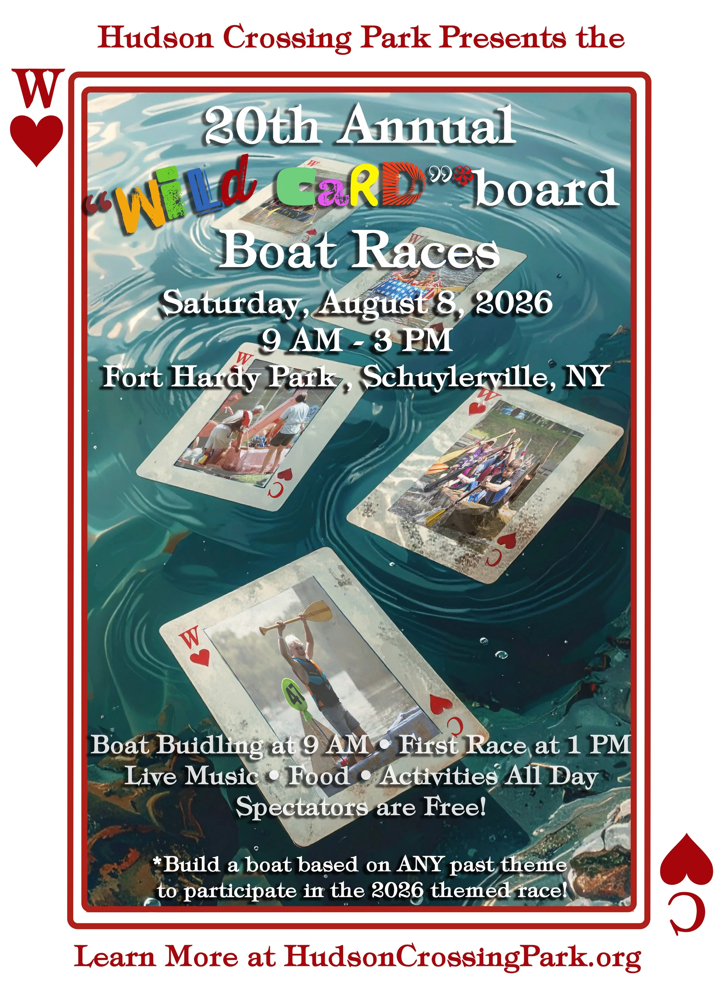 2026 marks the 20th anniversary of Hudson Crossing Park’s Cardboard Boat Races, so to celebrate this amazing milestone we’re making this year’s races a Wild Card! Build your boat based on ANY past theme to participate in the 2026 themed race! Join us at Fort Hardy Park Beach in Schuylerville for a day filled with excitement and laughter as sailors of all ages compete in the ultimate cardboard challenges.
